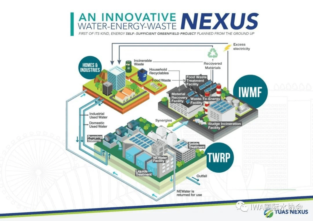 Tuas再生水厂还是新加坡第一座水与固废综合处理设施Tuas Nexus的核心部分。在PUB和新加坡国家环境署(NEA)合作的Tuas Nexus在设计和规划阶段就融入了能源自给和降低碳排放的目标,将固体废物和水处理过程结合起来,利用各种协同效应,改善整个系统的处理效果的同时减少温室气体排放,并优化土地利用。